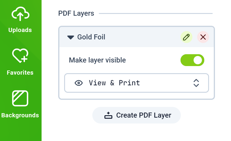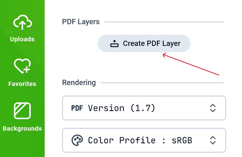Click the Design panel on the left and find PDF Layers. Click the button to create a new Layer and give it a title.