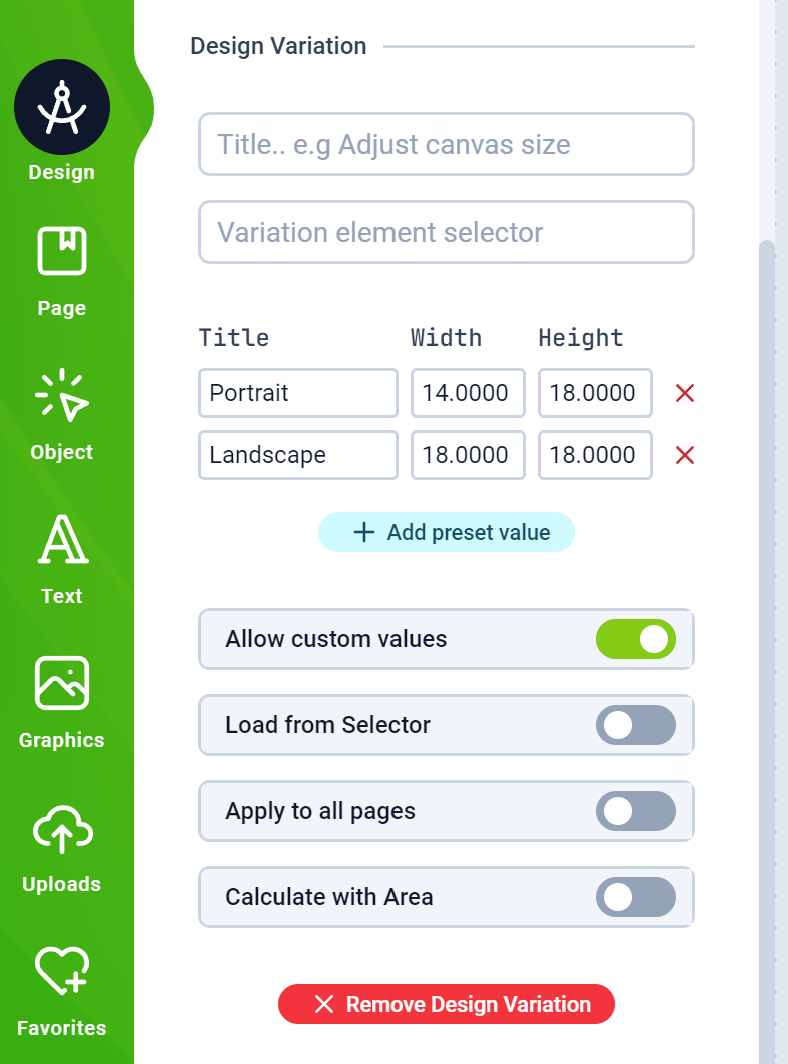 Allow Custom Values: Enabling this allows customers to create their own unique size dimensionLoad from selector: This allows the Editor to load values from your product page.Apply to all pages: This will apply the dimension to all pages and not just the current oneCalculate with areaEnabling this option propagates thewidth x heightarea as a single value to your product page price calculator