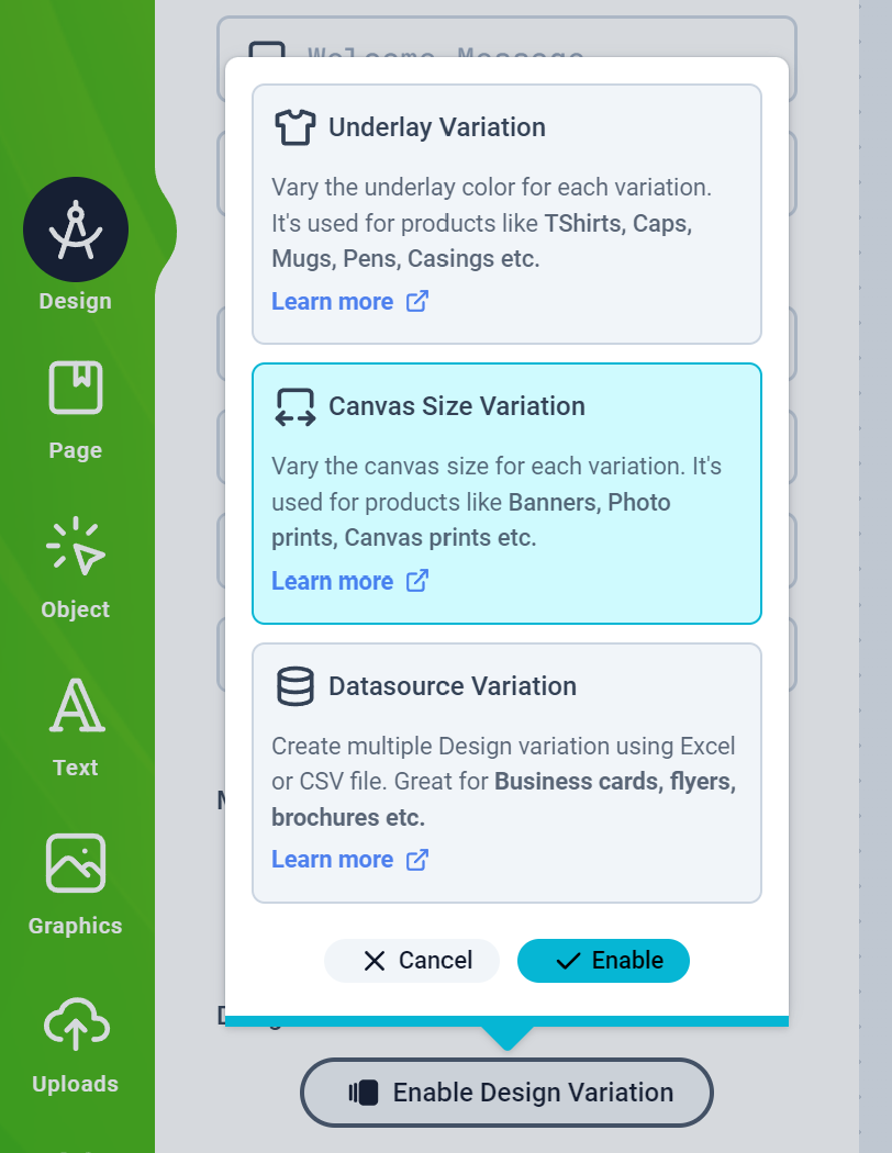 Click the Design tab on the left panel and then click the Enable Design Variation button to select the Canvas Size Variation and Enable it