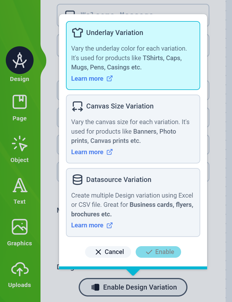 - If the Tint option is turned off, you will need to upload Underlay images for each color variants and for each page. Eg. Front and Back of a TShirt.